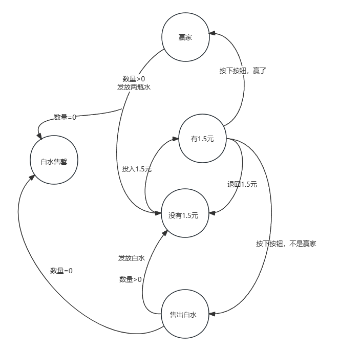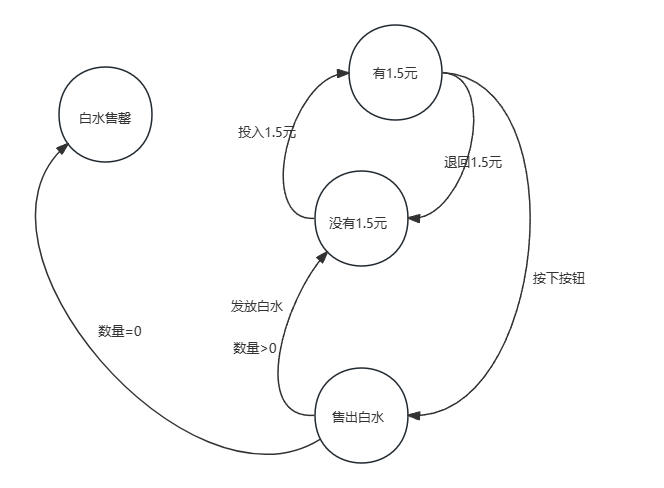 假设自动贩卖机只贩卖白水这一种商品,自动贩卖机的设计师为我们提供了一张状态图,希望我们设计程序供他们的机器使用,我们先来看一下