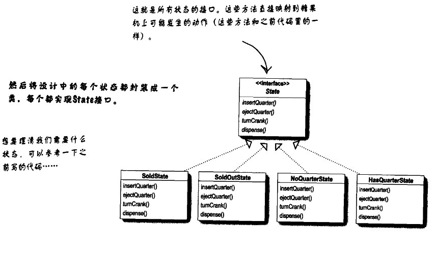 这个描述中的第一部分附有相当多的涵义,是吧?因为这个模式将状态封装成为独立的类,并将动作委托到代表当前状态的对象,我们知道行为会随着内部状态而改变。贩卖机提供了一个很好的例子,当贩卖机是在未投币或已投币两种不同的状态时,你投入1.5元钱,就会得到不同的行为(机器接受1.5元和机器拒绝1.5元)。